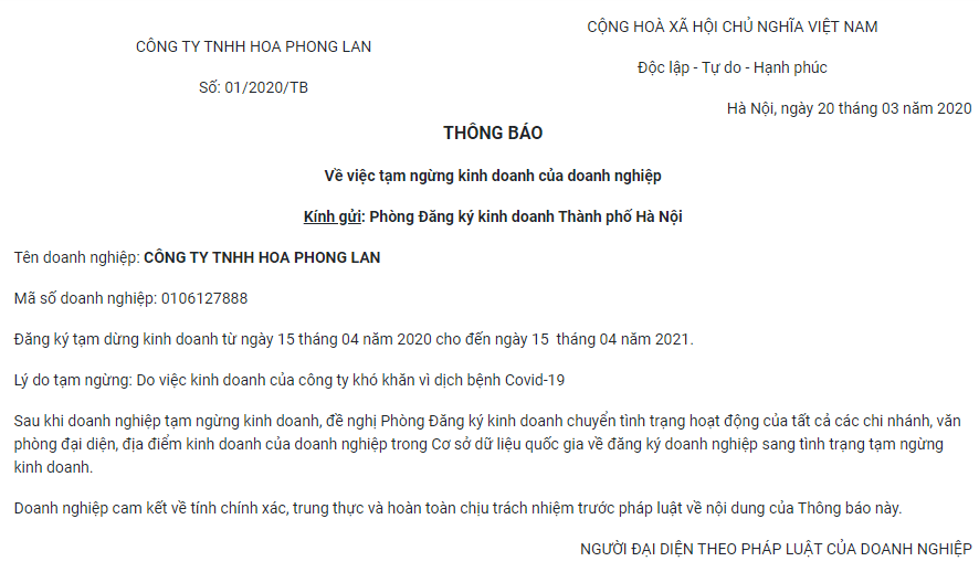- Thông báo tạm ngừng kinh doanh (Phụ lục II-21, Thông tư số 02/2019 / TT-BKHĐT);